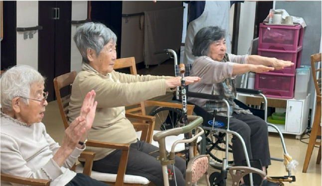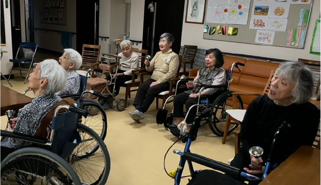 音楽の力で自然と身体が動き、会話も弾みます。スタッフも一緒に参加しながら、笑顔あふれる時間を過ごしています。