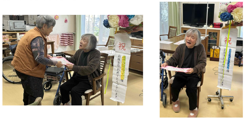 11月生まれの入居者さんのお誕生会がおこなわれました。スタッフとご入居者で一緒にお祝いしたお誕生会。ハッピーバースデーの歌をみんなで歌い、笑顔と拍手があふれるひとときとなりました。別のご入居様から「長生きしてね」と声がかかり、さらに温かい雰囲気に包まれました。