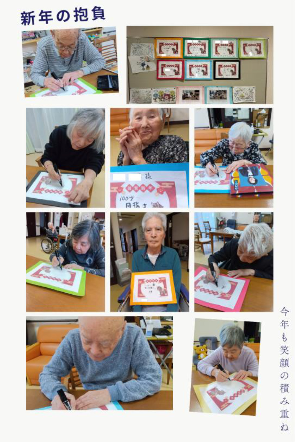 新しい年の始まりに、入居者の皆さんと一緒に「新年の抱負」を紙に書きました。「元気に過ごしたい」「みんなと仲良く」「100歳まで頑張る!」など、それぞれの思いが込められた言葉が並びました。書いた抱負は額に入れて飾り、みんなで眺めながら、笑顔のひとときを過ごしました。今年も一日一日を大切に、穏やかな時間を重ねていきたいと思います。